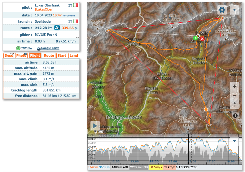 Il simpatico Lukas Oberfrank, che collabora con la grande scuola Flugschule Suditirol, lo ha fatto: il 10 aprile ha deciso di scartare la sua nuova Niviuk PEAK 6 e di inaugurarla in grande stile, con un fantastico volo di ben 213 km, che lo ha tenuto in aria per poco più di 8 ore.