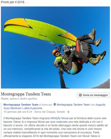 Ringraziamo il monte grappa Tandem Team per aver scelto Infinity Fly e il Takoo 4 e Niviuk Gliders per questa nuova macchina da sogno!