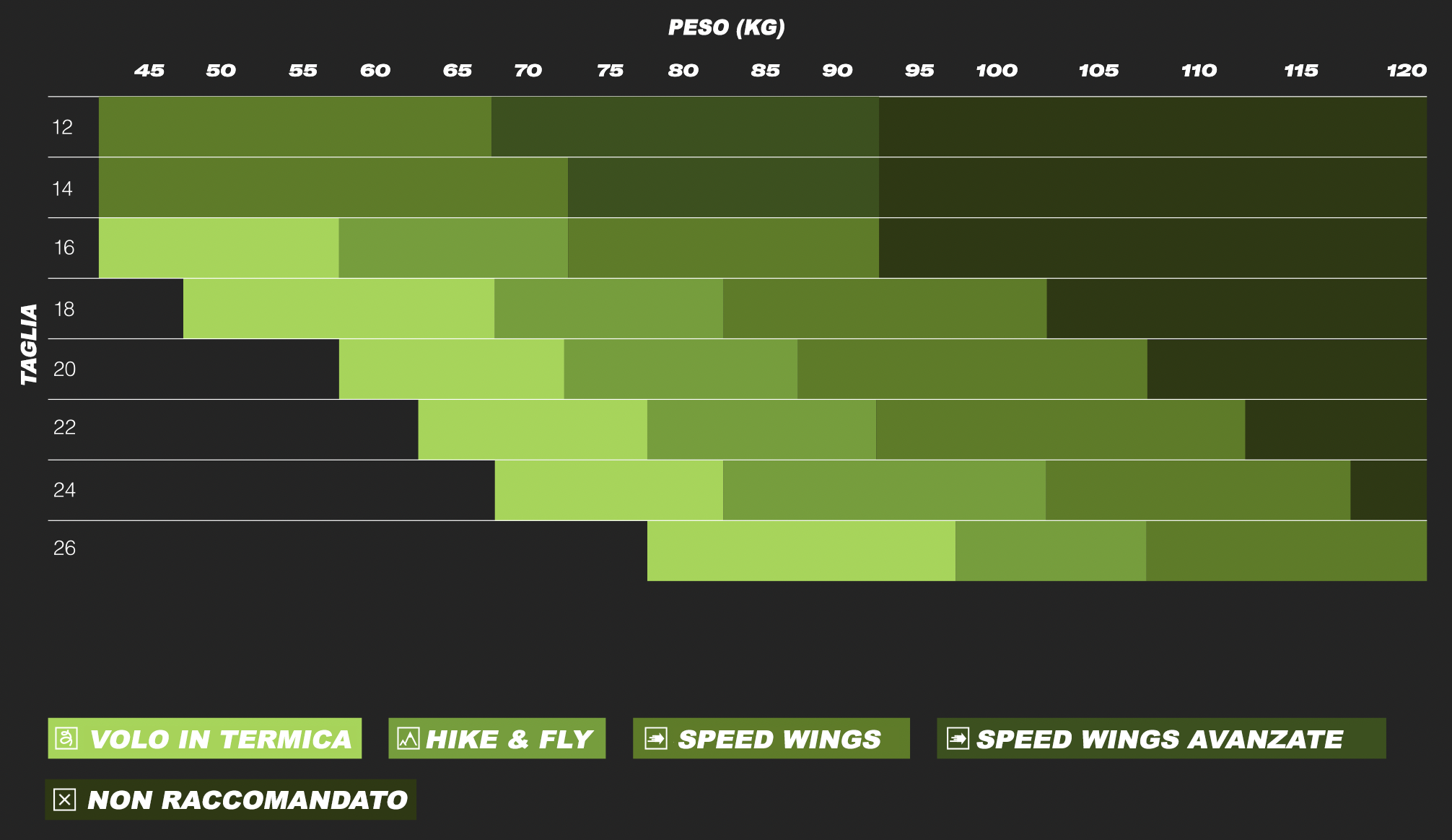 Le taglie 16 e 18 sono ideate per piloti con esperienza con capacità di pilotagio attivo, considerando che il range di peso influenzerà le reazioni della vela e le sue caratteristiche durante il volo.