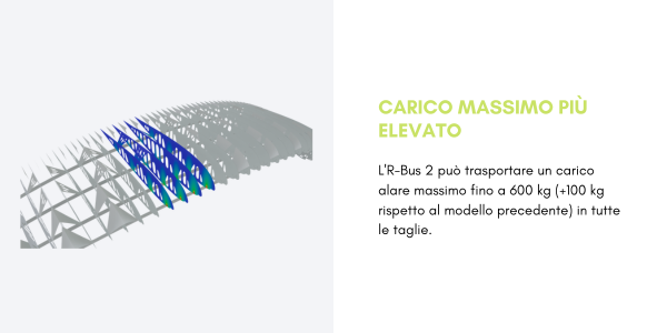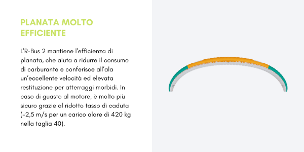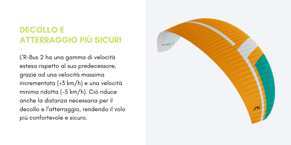 Goditi i tuoi voli tandem in paramotore in modo più sicuro e confortevole, con la possibilità di trasportare fino a 600 kg. L’R-Bus 2 è molto più stabile in volo, così che sia il pilota che il passeggero possano vivere un’esperienza indimenticabile. Con una vasta gamma di velocità, consente decolli e atterraggi a basse velocità.